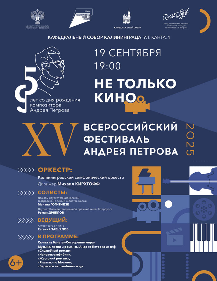 19 сентября в Кафедральном соборе Калининграда состоится торжественное открытие XV Всероссийского фестиваля Андрея Петрова. Первым событием фестиваля станет концерт «Не только кино», который соберёт поклонников творчества композитора, ставшего современным классиком. В этот вечер на сцене прозвучат сюита из балета «Сотворение мира» и известные мелодии, знакомые многим по любимым фильмам: вальсы из т/с «Петербургские тайны», увертюра из к/ф «Укрощение огня», песни и романсы из к/ф «Жестокий романс», «Я шагаю по Москве», «Служебный роман», «Человек-амфибия» и других легендарных кинокартин.