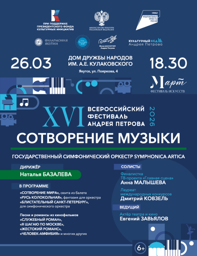 26 марта в Якутске в Доме дружбы народов им. А.Е. Кулаковского состоится торжественное открытие XVI Всероссийского фестиваля Андрея Петрова. Первым событием фестиваля станет концерт «Сотворение музыки», который соберёт поклонников творчества композитора, ставшего современным классиком. В этот вечер прозвучат произведения композитора: фантазия для симфонического оркестра «Русь колокольная», оркестровая пьеса «Блистательный Санкт‑Петербург», сюита из балета «Сотворение мира» и известные мелодии, знакомые многим по любимым фильмам: вальс из к/ф «Берегись автомобиля», песни и романсы из к/ф «Жестокий романс», «Я шагаю по Москве», «Служебный роман», «Человек‑амфибия», «Старая, старая сказка» и других легендарных кинокартин.