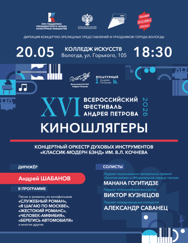 20 мая концерт «Киношлягеры» в рамках XVI Всероссийского фестиваля Андрея Петрова пройдет в Вологде в Концертном зале Колледжа искусств. Этот вечер соберёт зрителей, чтобы насладиться бессмертной музыкой, которая является неотъемлемой частью отечественного кинематографа. В программу концерта войдут: вступление из к/ф «Вокзал для двоих», вальс из к∕ф «Берегись автомобиля», песни и романсы из таких фильмов, как «Жестокий романс», «О бедном гусаре замолвите слово», «Служебный роман», «Человек-амфибия», «Я шагаю по Москве», «Батальоны просят огня», «Путь к причалу» и других.