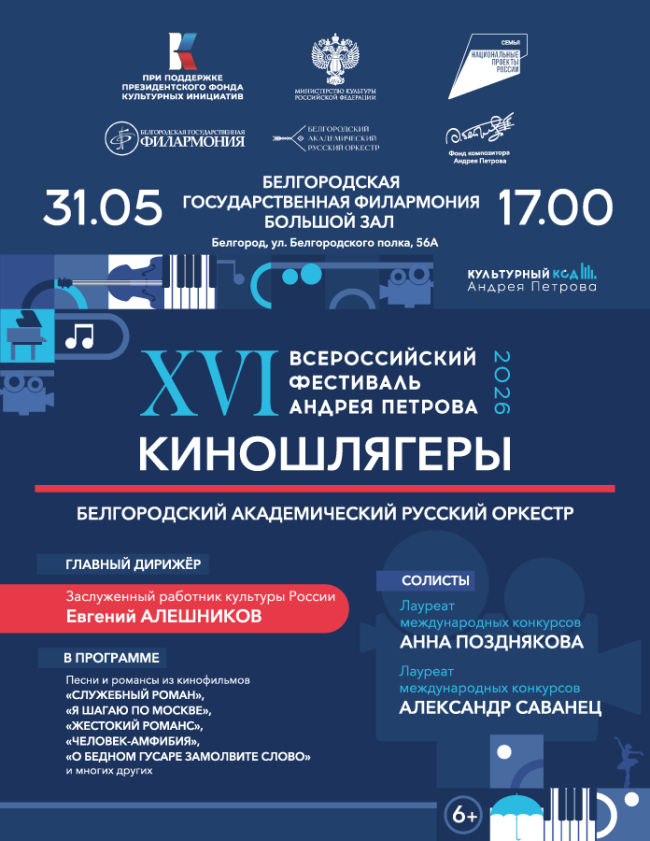 31 мая в рамках XVI Всероссийского фестиваля Андрея Петрова в Белгородской государственной филармонии пройдёт концерт «Киношлягеры». Этот вечер объединит зрителей, чтобы насладиться бессмертной музыкой, которая является неотъемлемой частью отечественного кинематографа. В программу концерта войдут: вальсы из к∕ф «Берегись автомобиля» и т∕ф «Петербургские тайны», юмореска из к∕ф «Зайчик», вступление из к∕ф «Вокзал для двоих», песни и романсы из таких фильмов, как «Жестокий романс», «О бедном гусаре замолвите слово», «Служебный роман», «Человек‑амфибия», «Я шагаю по Москве», «Два воскресенья», «Путь к причалу» и других.
